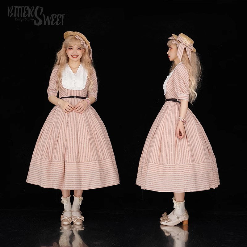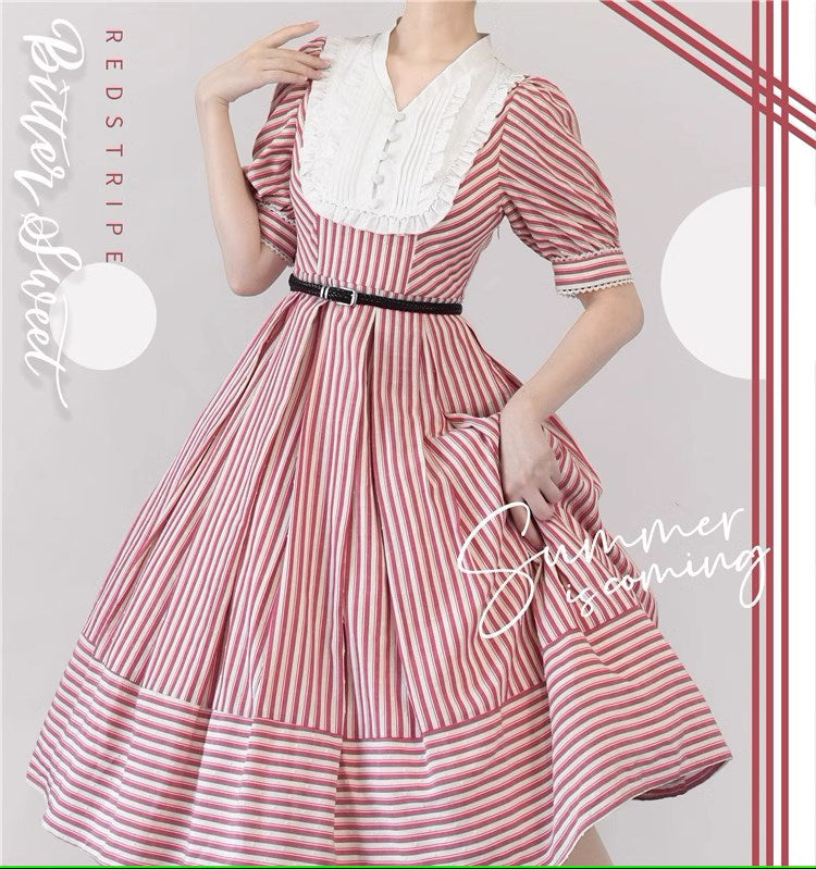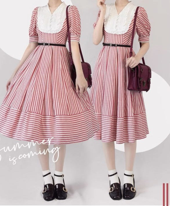 白襟とストライプが爽やかなワンピース。共布ベルト付き。